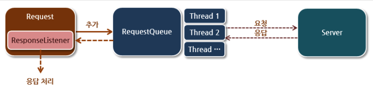 ReaquestQueue가 알아서 쓰레드를 생성하여 서버에 요청을 보내고 응답을 받는다.
