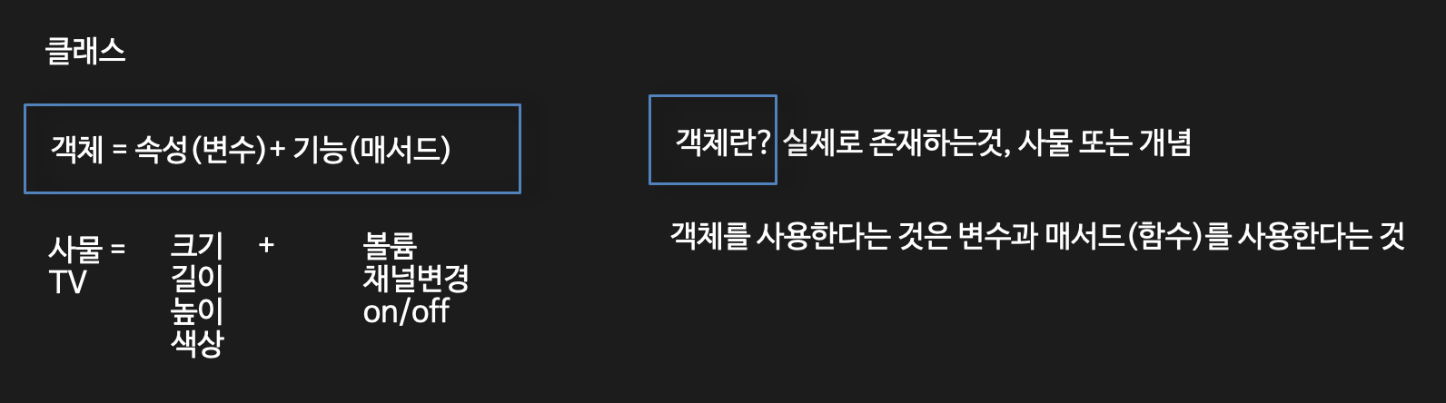 - 객체는 클래스를 통해 만들어진 프로그램의 구성요소이다.