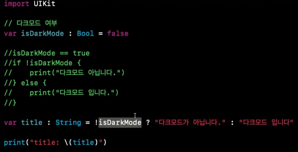 - if 뒤의 조건 값에는 Bool 타입의 값만 위치해야 합니다.