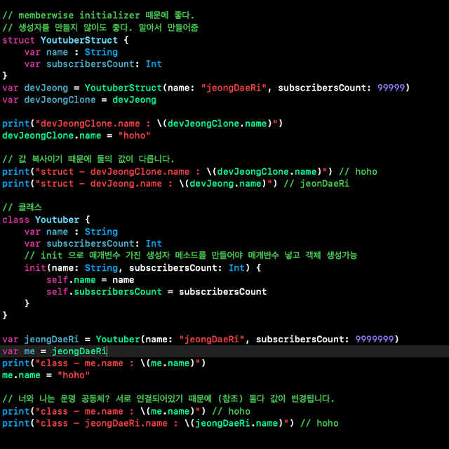 init이 있다.(초기값을 설정한다.) 생성자를 만드는것 = 메모리에 올린다. // init으로 매개변수를 넣어서 그값을 가진 객체(object)를 만들 수 있다. 클래스는 공유해서 사용하는 개념. 참조( =메모리 주소를 가리킨다.레퍼런스)하는 값이 바뀌면 기존값도 바뀐다. |
