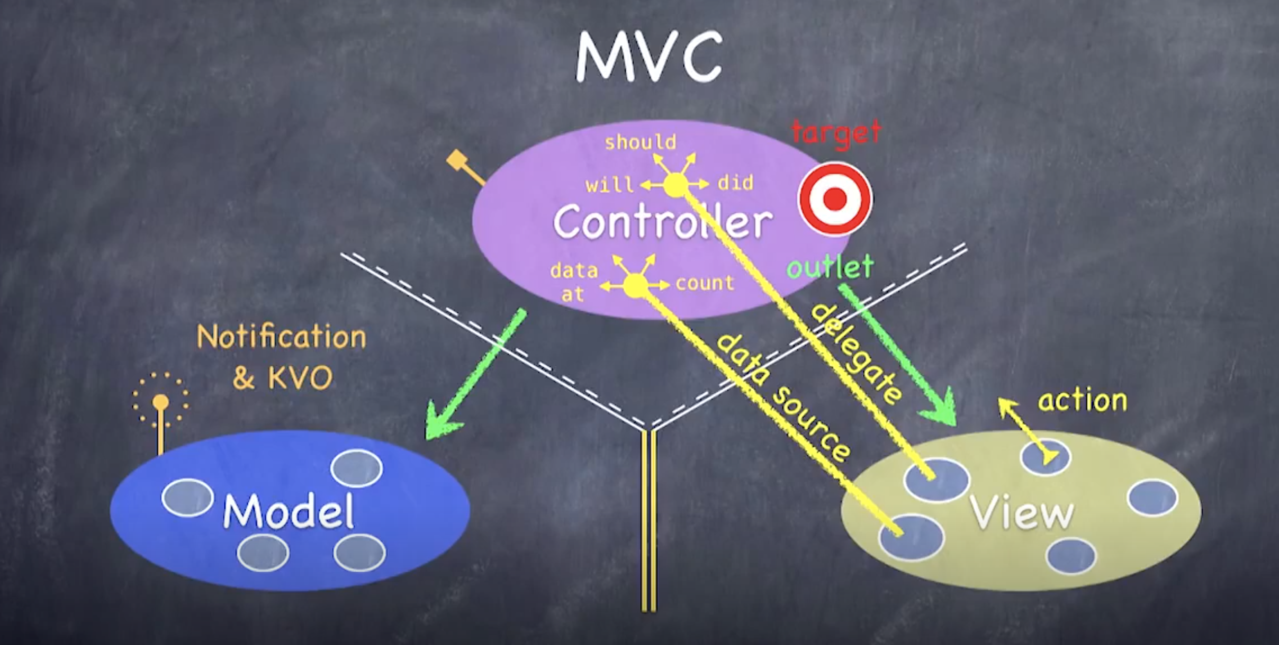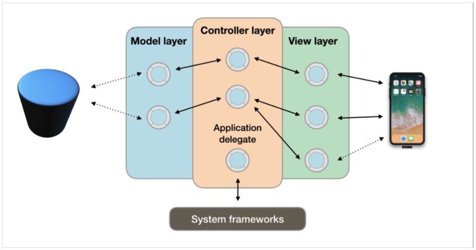 iOS의 뷰 컨트롤러는 UIViewController 서브클래스의 인스턴스입니다. UIKit은 UITableViewController와 같은, UIViewController의 여러 특수 목적 서브클래스를 제공합니다. 컨트롤러가 모델과 뷰 간에 데이터를 중개하도록 반드시 프레임워크의 뷰-컨트롤러 클래스(예 : UIViewController, UITableViewController 등)를 확장하십시오. 뷰 컨트롤러는 여러 가지 프레임워크 객체에 대한 델리게이트 혹은 데이터 소스 객체인 경우가 많습니다.