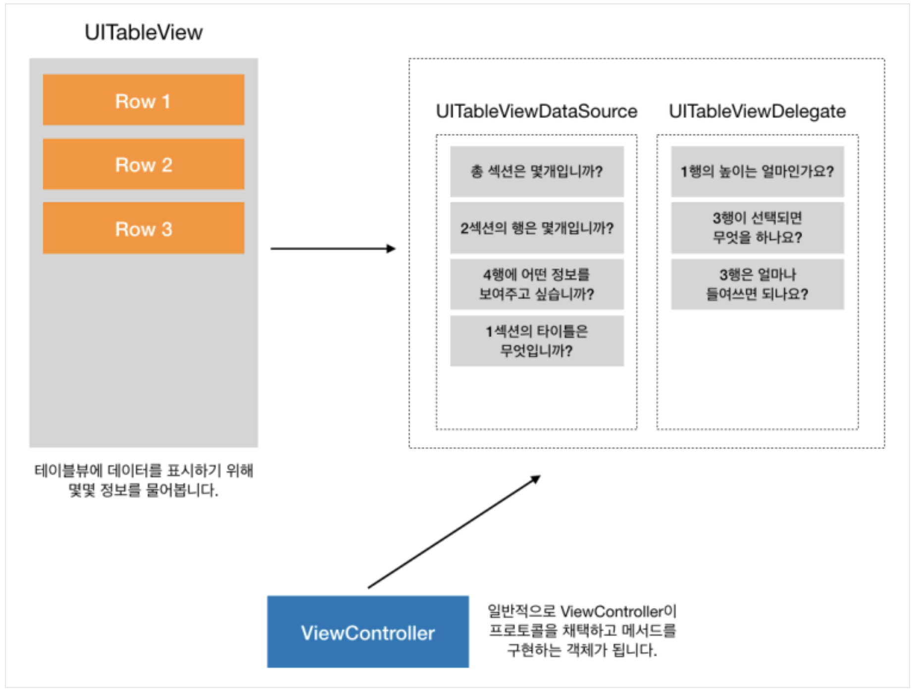 - 테이블뷰 데이터 소스 객체는 UITableViewDataSource 프로토콜을 채택합니다.