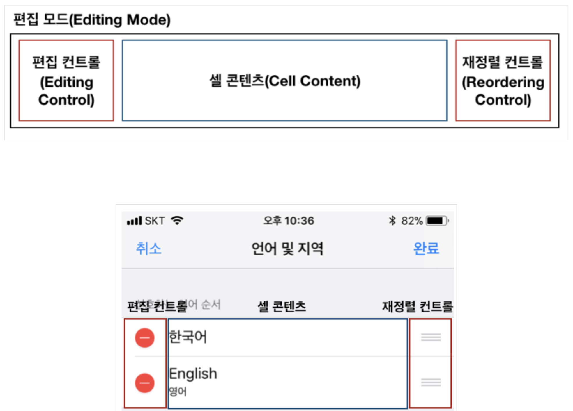 - 액세서리뷰 영역: 셀의 오른쪽 작은 부분은 액세서리뷰로 상세보기, 재정렬, 스위치 등과 같은 컨트롤 객체가 위치합니다.