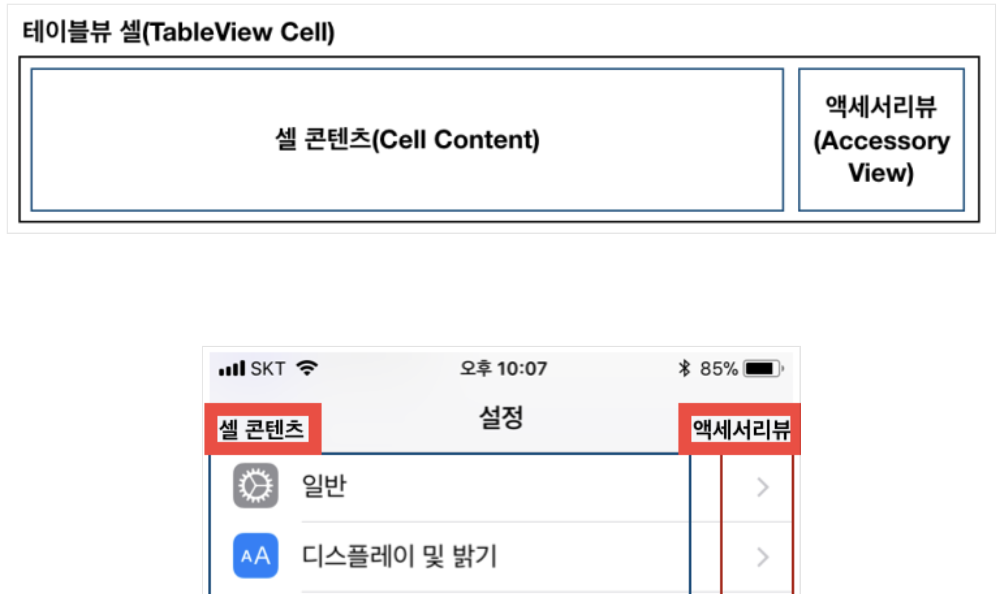 기본적으로 테이블뷰 셀은 아래 이미지와 같이 크게 콘텐츠 영역과 액세서리뷰 영역으로 구조가 나뉩니다.