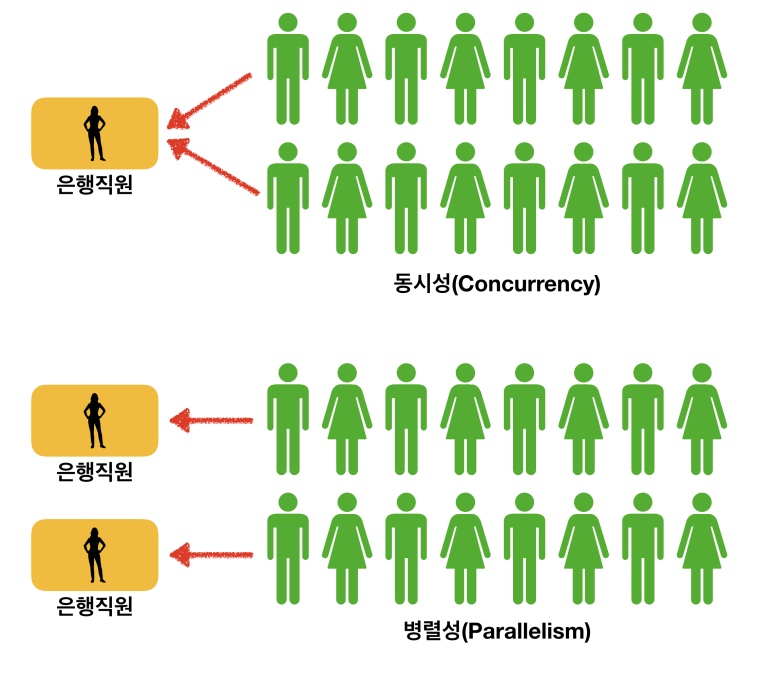 - 동시성(Concurrecny) : 통장을 만들러 온 N개의 대기열과 한 명 이상의 은행직원