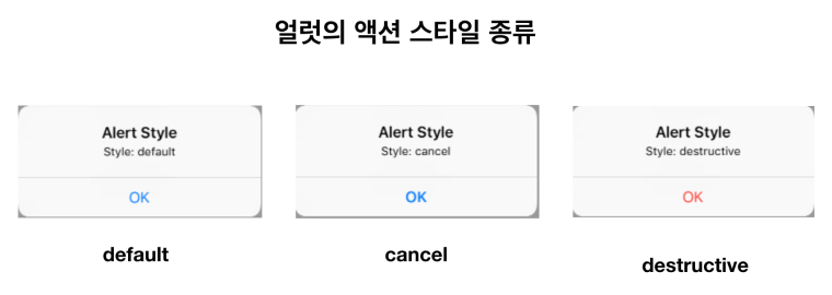 - var style: UIAlertAction.Style: 액션 버튼의 적용될 스타일입니다.