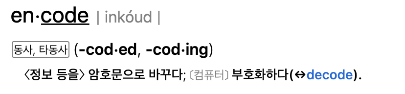 인코딩(Encoding)은 정보의 형태나 형식을 표준화, 보안, 처리 속도 향상, 저장 공간 절약 등을 위해서다른 형태나 형식으로 변환하는 처리 혹은 그 처리 방식을 뜻합니다(출처 : 위키백과 - 부호화).