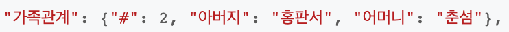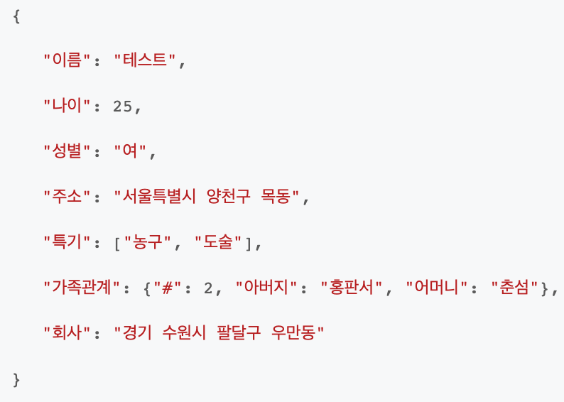 | JSON 객체 | { 키 : 값 , 키: 값 } | 여러 속성을 정의하는 순서 없는 집합 |
