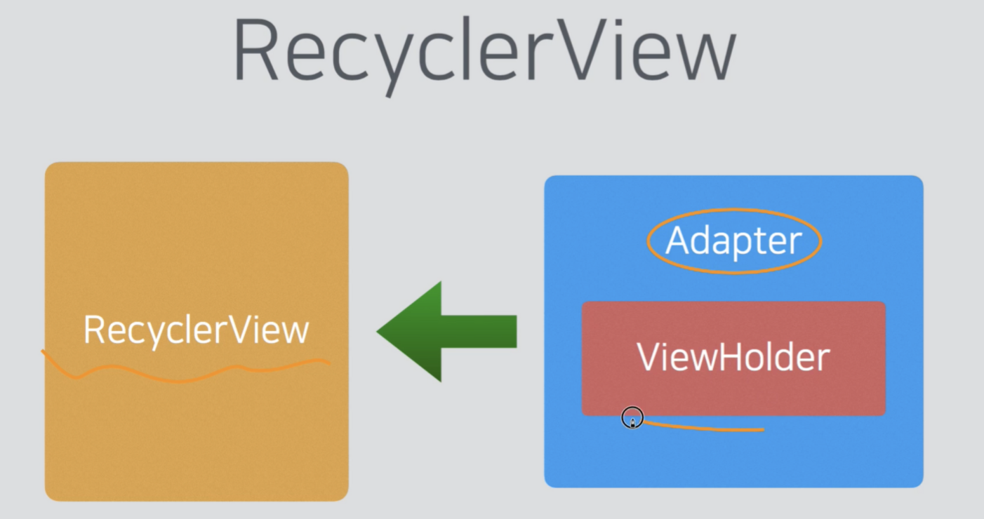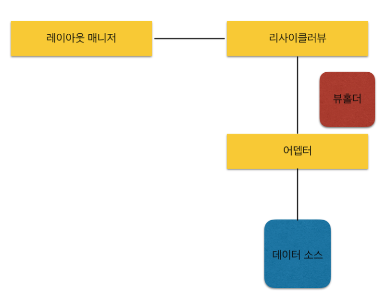 - 어뎁터가(뷰홀더를 전달) ->리사이클러뷰에게 전달시킨다.