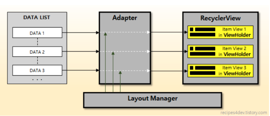 레이아웃 매니저 : 리사이클러뷰에게 뷰를 어떻게 보여줄지 말해줌.