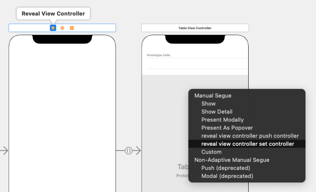 메인컨트롤러와 테이블뷰 컨트롤러를 메뉴얼 세그웨이 방식으로 연결한다.