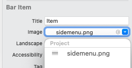 FrontViewController의 네비게이션 바 좌측 여역에 바버튼 아이템을 추가하고, 추가한 이미지를 지정한다.