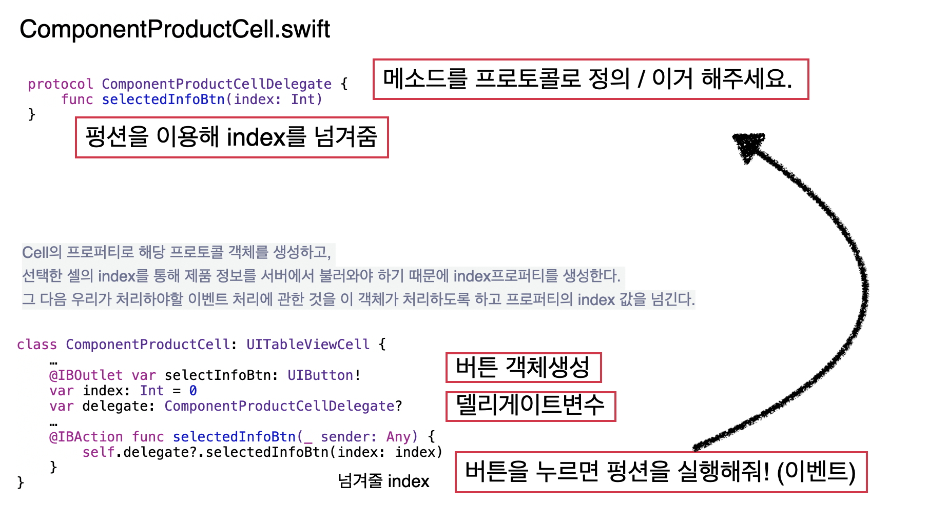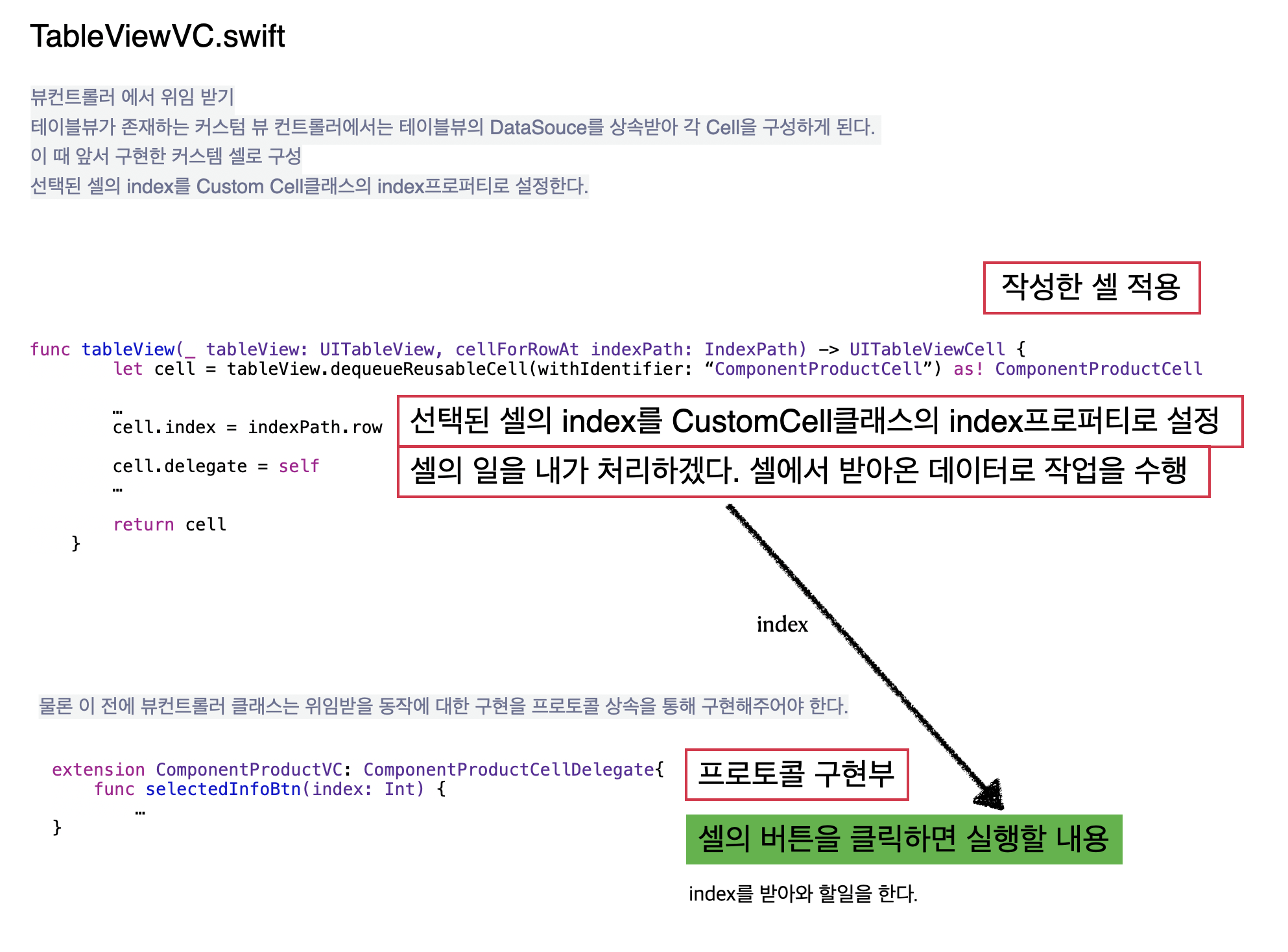 | 커스텀셀이 위임을 요청 -> | 뷰컨트롤러의 테이블뷰가 요청을 받고, 커스텀셀의 일을 대신해줌 |