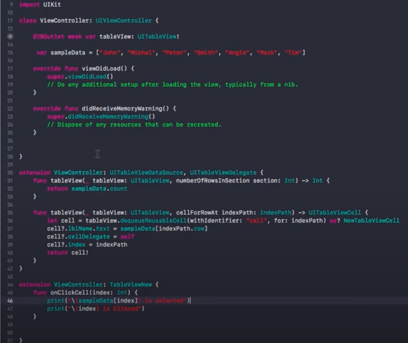 프로토콜 구현부를 작성한다.( 셀 클릭시에 indexPath를 가져온다. / indexPath에 해당하는 데이터내용을 가져온다.)