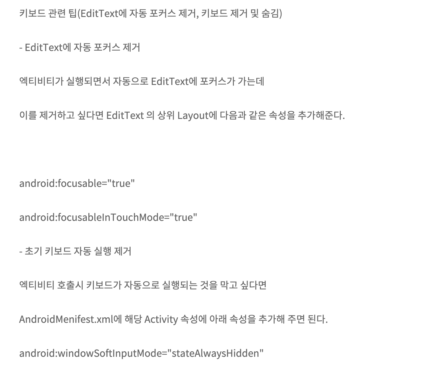 개발팁]안드로이드 키보드 체크(EditText에 자동 포커스 제거, 키보드 제거 및 숨김)