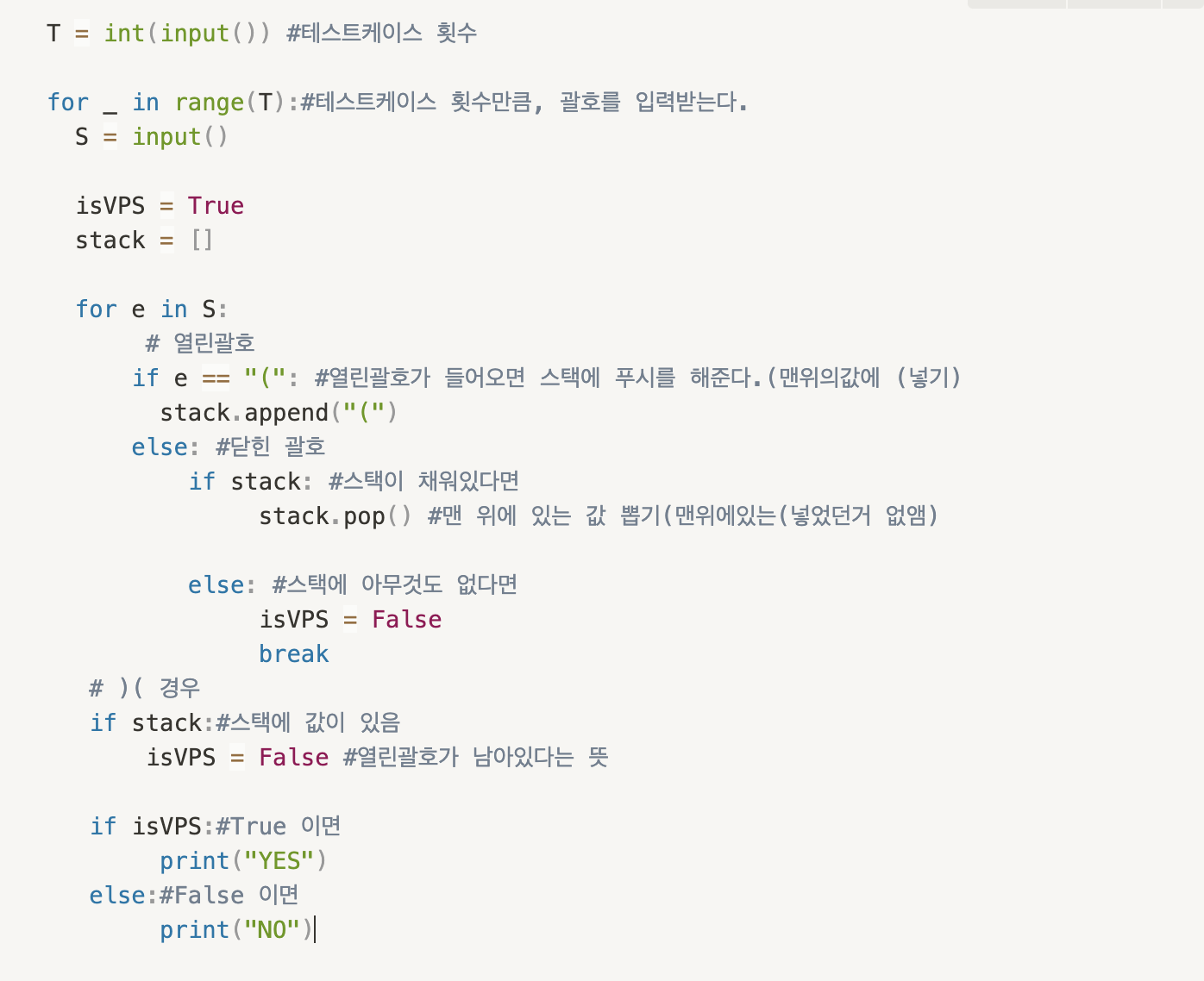 출력은 표준 출력을 사용한다. 만일 입력 괄호 문자열이 올바른 괄호 문자열(VPS)이면 “YES”, 아니면 “NO”를 한 줄에 하나씩 차례대로 출력해야 한다.