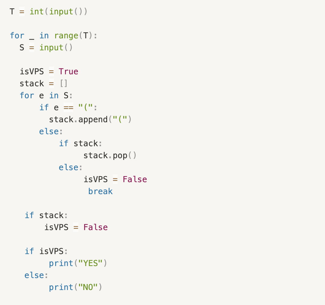 여러분은 입력으로 주어진 괄호 문자열이 VPS 인지 아닌지를 판단해서 그 결과를 YES 와 NO 로 나타내어야 한다.