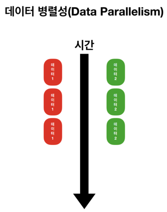 - 데이터 병렬성 : 전체 데이터를 나누어 서브 데이터들로 만든 뒤, 서브 데이터들을 병렬 처리해서 작업을 빠르게 수행하는 방법입니다.