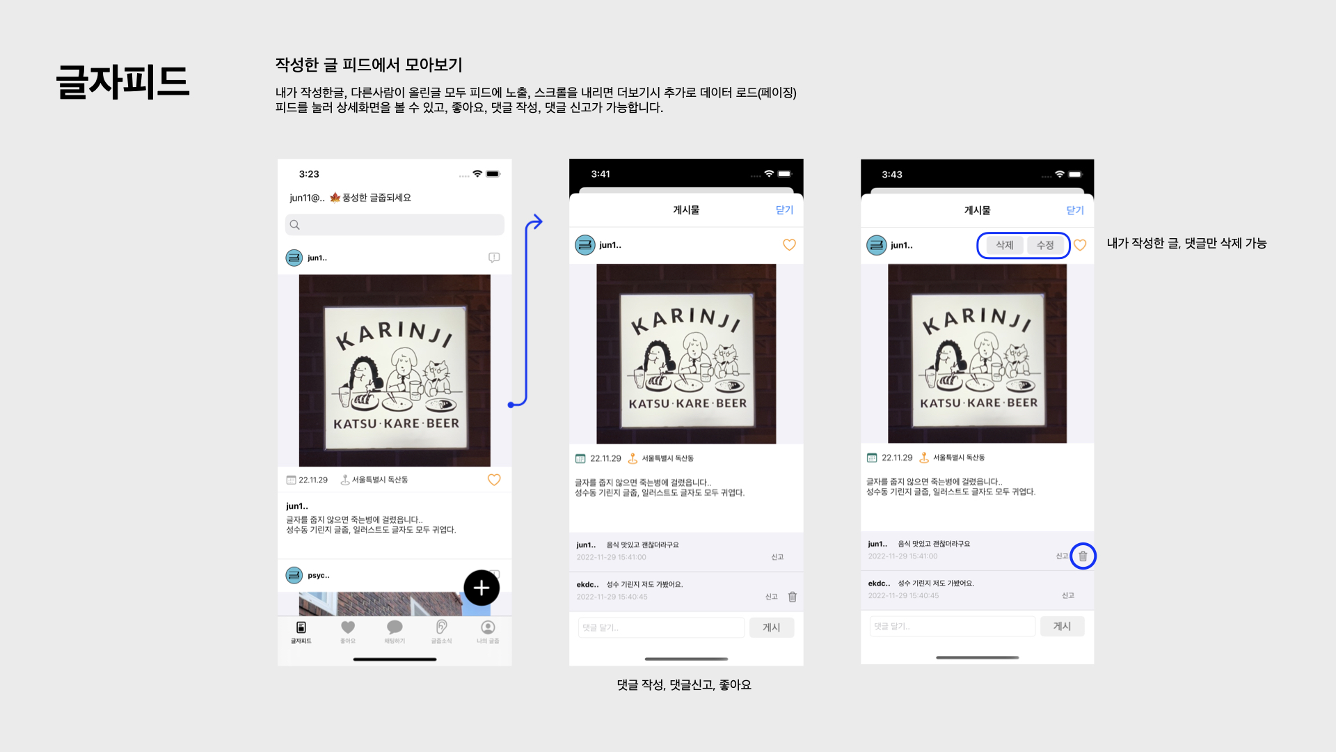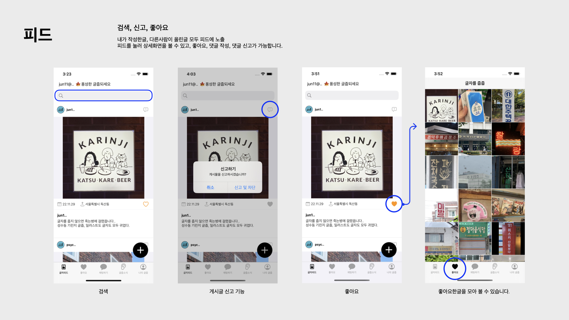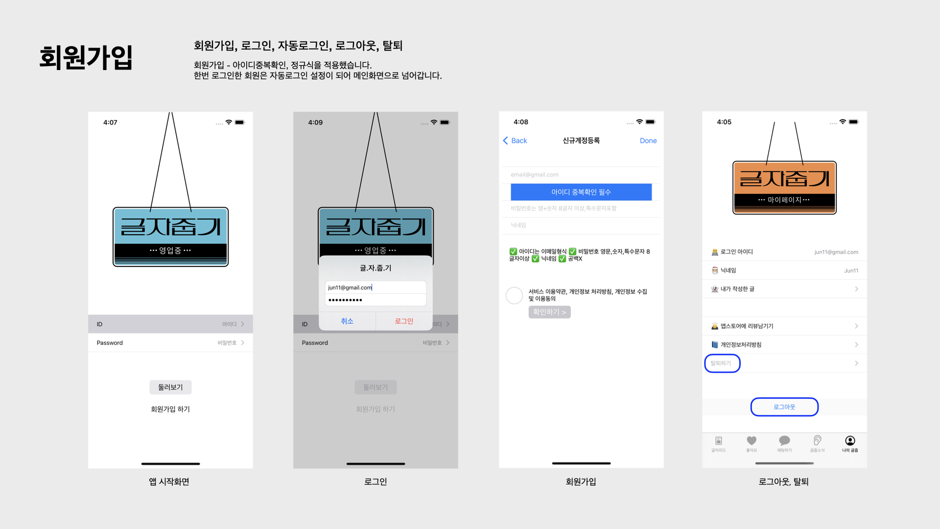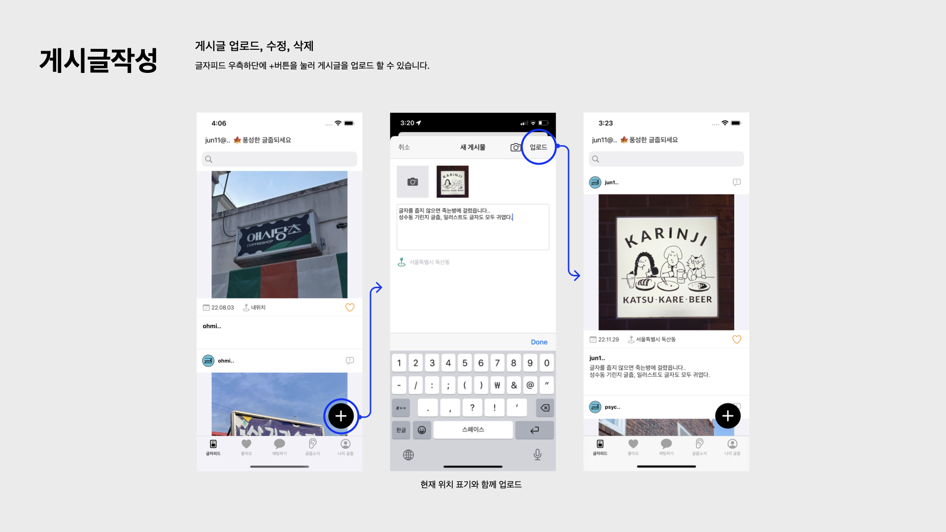 ▶ 글자줍기 주요기능 - 글줍소개 - 글자 이미지 업로드, 위치작성 - 좋아요한 사진 북마크 - 채팅기능(유저신고, 단어 필터링) - 게시글 키워드 검색 - 게시글,댓글 작성 및 신고 - 탈퇴하기