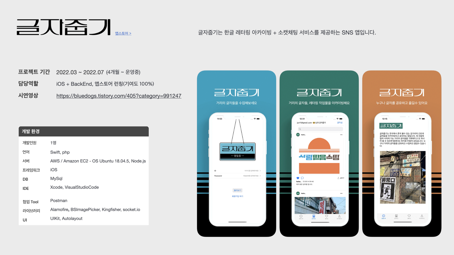 https://bluedogs.tistory.com/405 글자줍기 앱스토어 OPEN https://apps.apple.com/kr/app/%EA%B8%80%EC%9E%90%EC%A4%8D%EA%B8%B0/id1629812057 글자줍기 거리에서 글자를 주워보세요! 글자줍기는 한국에서 흔히 볼 수 있는
