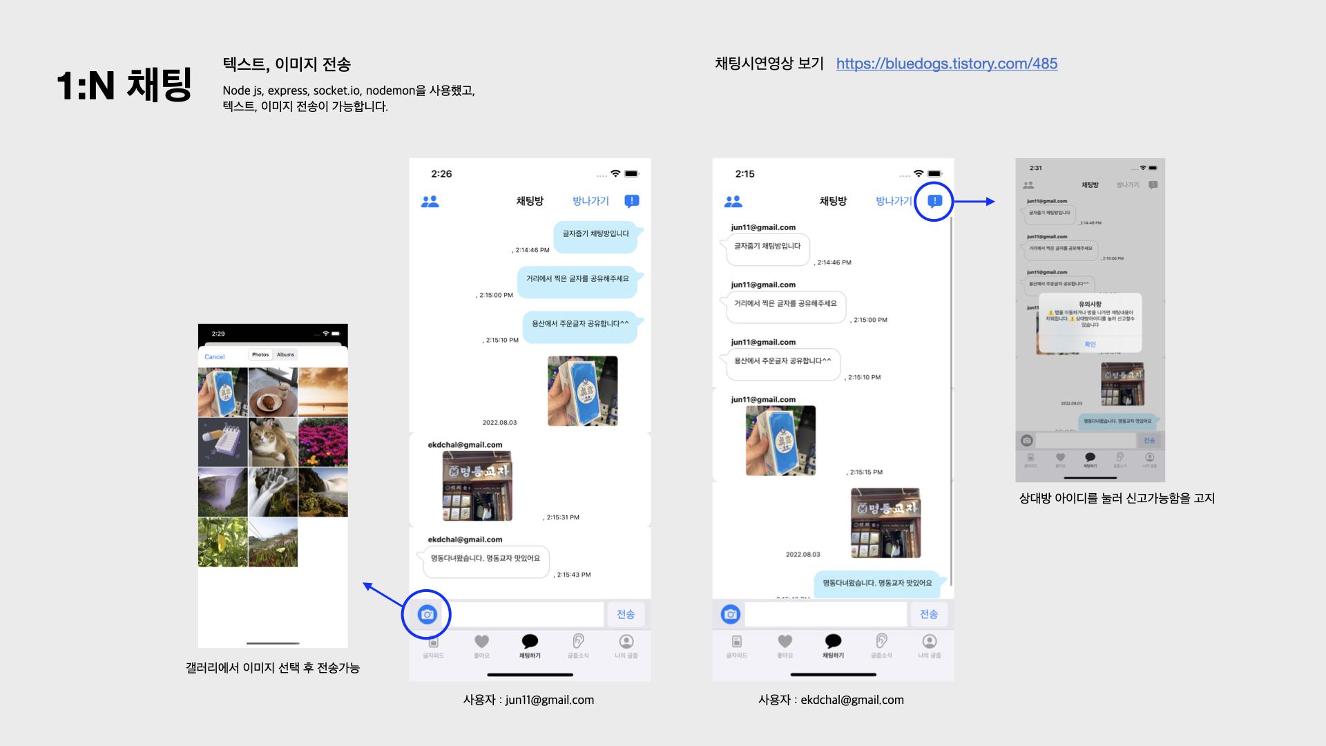글자줍기 1.0.7 업데이트 다중채팅 기능 (socket.io) - Node js, express, socket.io, nodemon - 실시간 채팅(이미지,텍스트 전송) - 채팅유저 신고기능 - 단어필터링 - 접속자 리스트표기 더보기 https://bluedogs.tisto