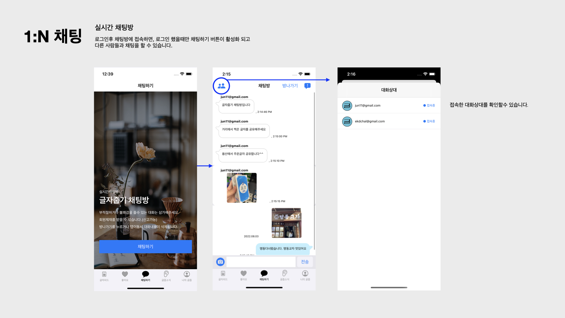 - 실시간 채팅(이미지,텍스트 전송), 채팅유저 신고기능, 단어필터링, 접속자 리스트표기