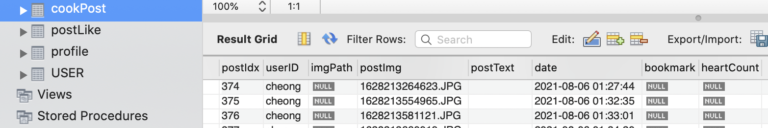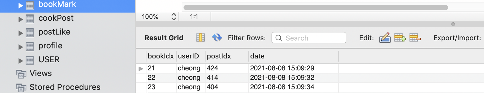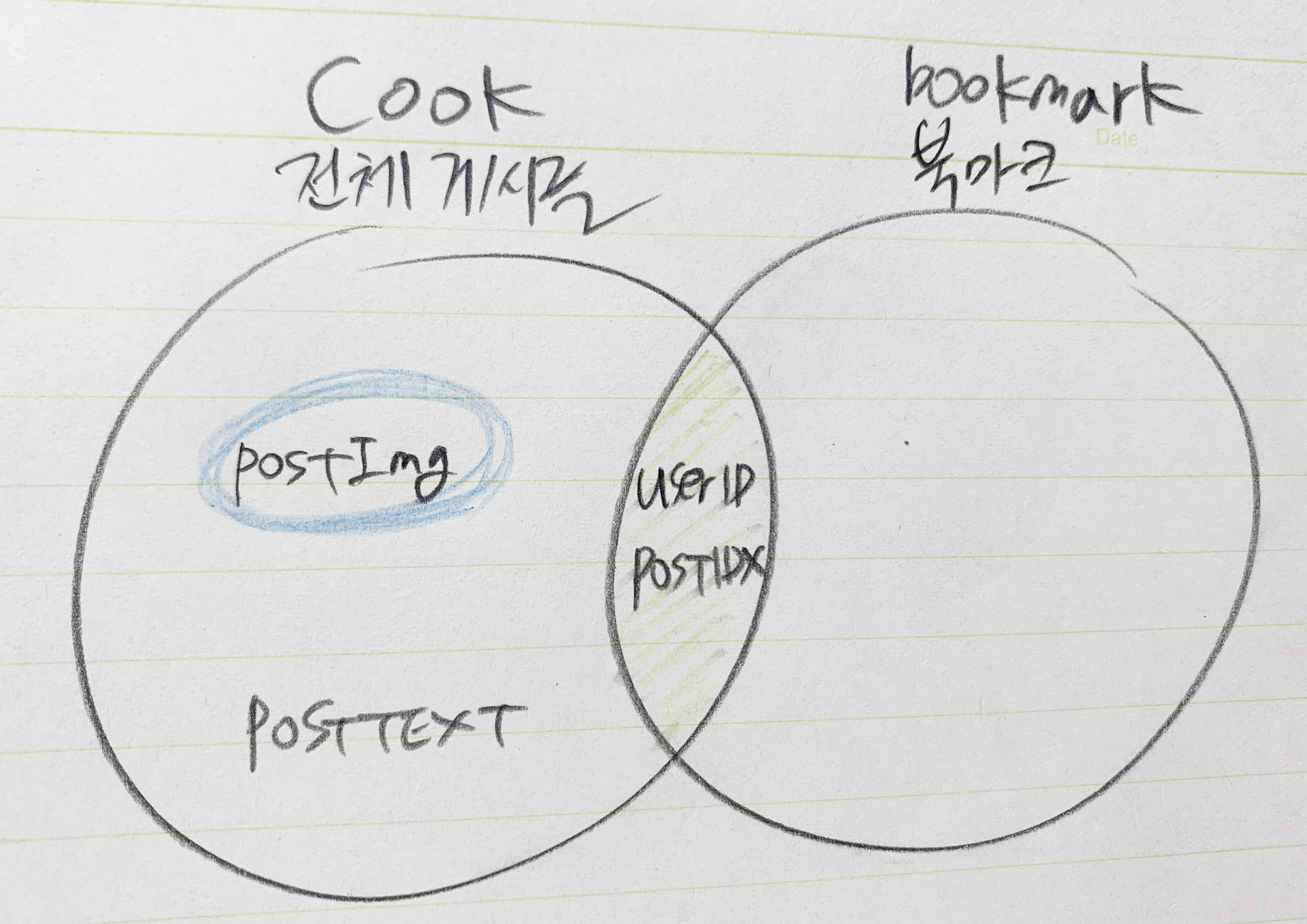 cookPost테이블은 게시글 전체 / bookmark테이블은 저장한 게시글의 모음이다.