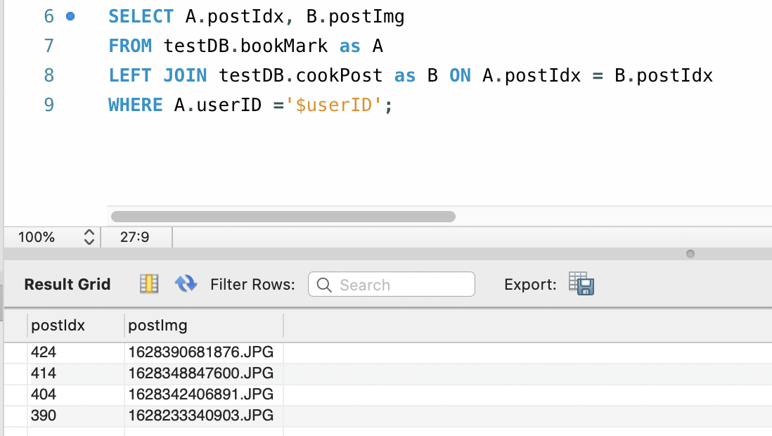 두테이블을 조인해서 가져오고 싶은 값 A.bookmark의 postIdx값과 B.cookPost의 postImg