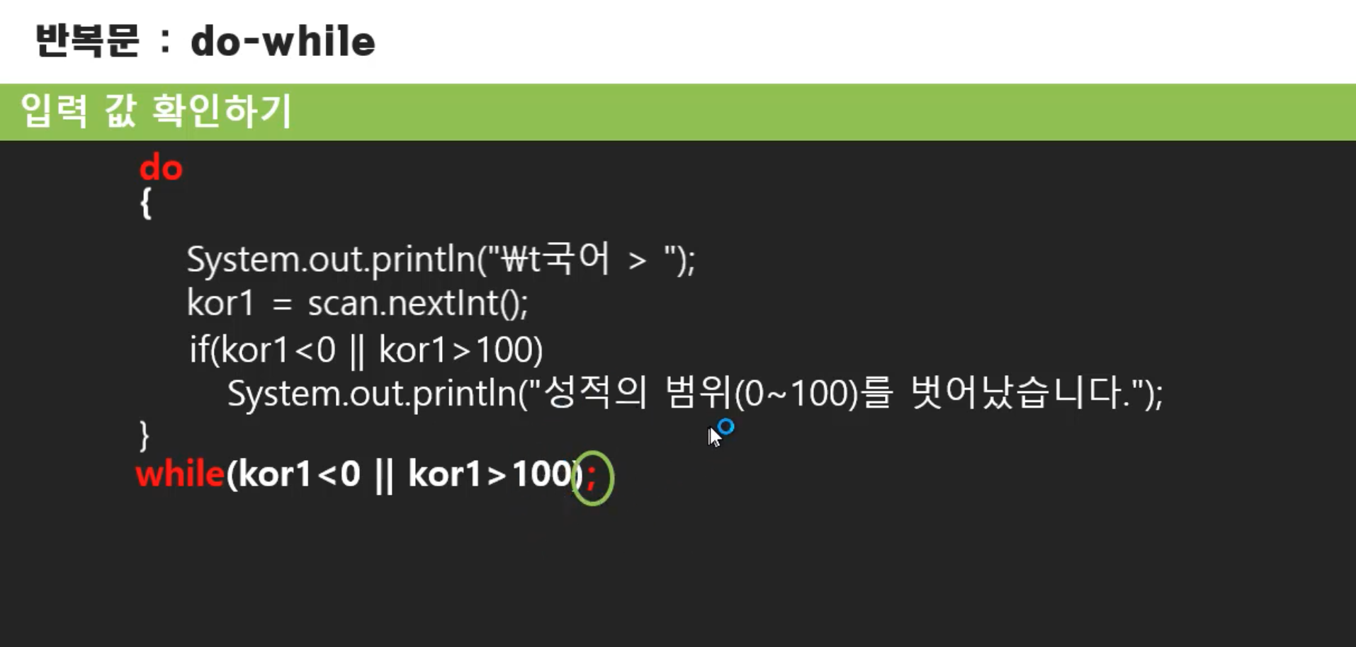 while에서 참을 확인하고 / 맞으면 do로 가서 다시 실행