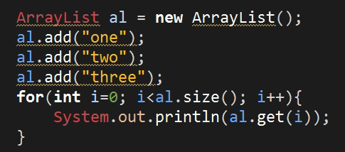 Arraylist al = new Arraylist();al.add("one"); // 괄호안의 데이터 타입은 object 형이어야 한다.al.add("two");al.add("three");for(int i =0; i< al.size(); i++){String value = (String)al.get(i); // 오브젝트를 스트링에 담고, string데이터 타입으로 형변환한다.System.out.println(al.get(value));} |