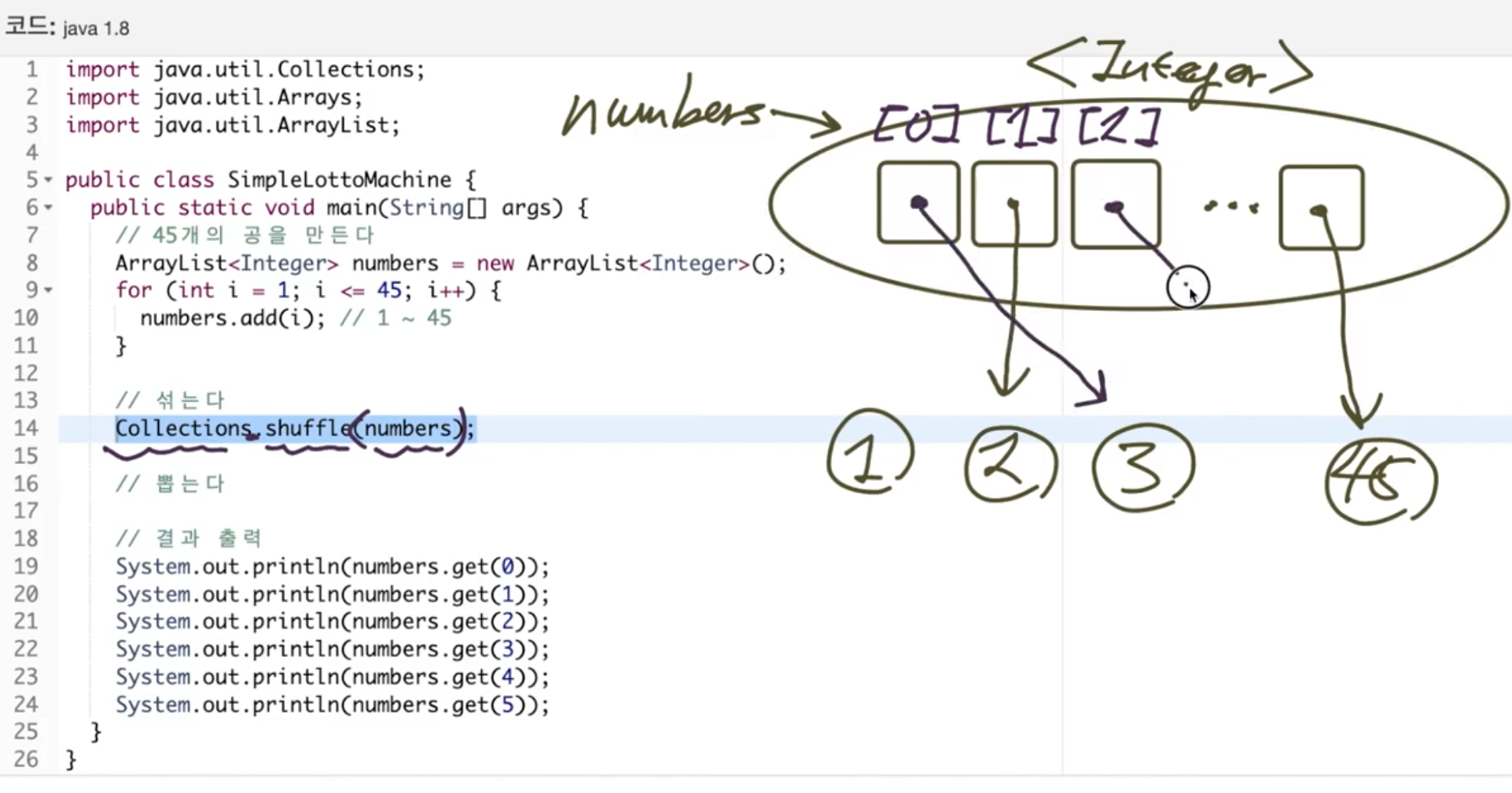 Arraylist <String> al = new Arraylist<String> ();al.add("one"); //al.add("two");al.add("three");for(int i =0; i< al.size(); i++){String value = al.get(i); // 제네릭으로 이미 타입을 정해주었으므로, 형변환하지 않아도 된다.System.out.println(al.get(value));} |